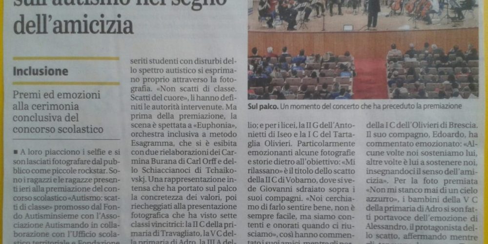 Anche quest’anno quindi si apre quindi la settimana dedicata alla sensibilizzazione sull’autismo, e come sempre noi di Euphonia arriviamo in anticipo; lunedì 1 Aprile abbiamo infatti avuto l’onore di esibirci in occasione della rassegna organizzata da AutismInsieme, di fronte ad un pubblico tutto nuovo: i ragazzi di 34 diverse scuole della provincia, presenti all’Auditorium San Barnaba per la premiazione del concorso “Autismo: scatti di classe. Spazi di inclusione e insoliti punti di vista della piccola comunità scolastica” (a.s. 2018/2019).